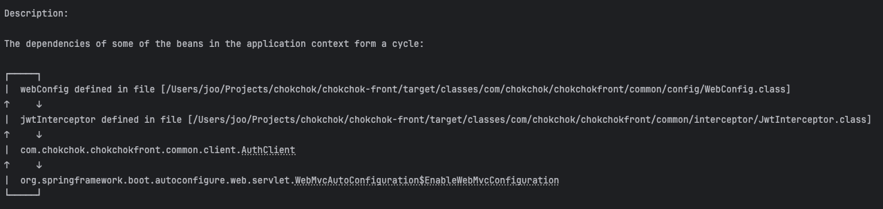 - 결국 WebConfig → JwtInterceptor → AuthClient → WebMvcAutoConfiguration → WebConfig 순환 참조 발생.