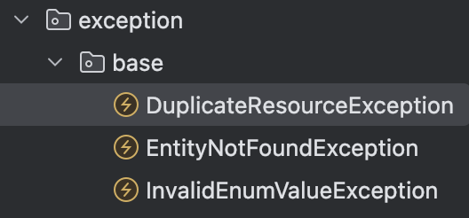 이전 팀 프로젝트에서는 예외를 좀 더 구체적이고 명확하게 표현하기 위해, 공통 예외 클래스를 베이스로 만들고 이를 상속하는 방식으로 처리했다.
