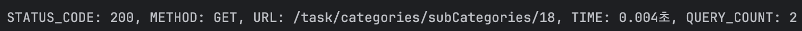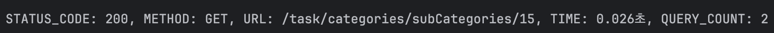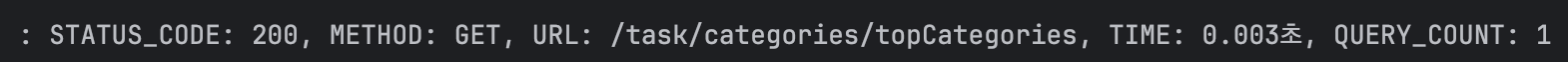 2025-08-15T12:53:08.032+09:00 INFO 76506 --- [task-service] [nio-8500-exec-1] c.n.t.c.log.QueryCountLoggingFilter : STATUS_CODE: 200, METHOD: GET, URL: /task/categories/header, TIME: 0.089초, QUERY_COUNT: 1