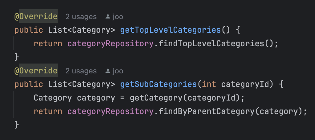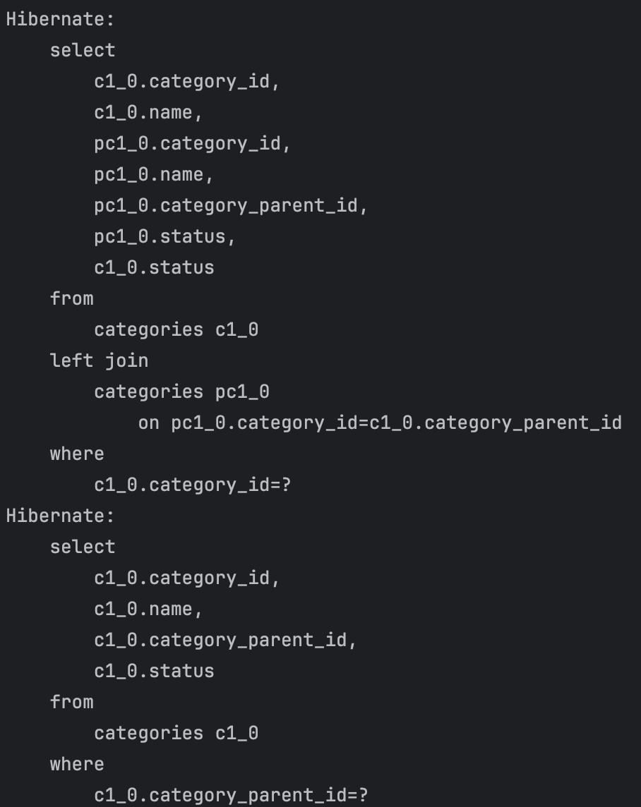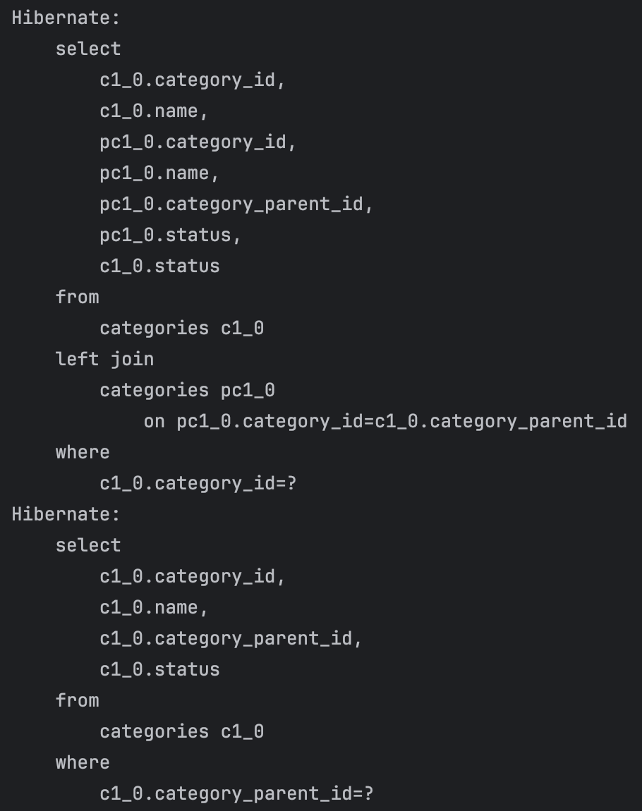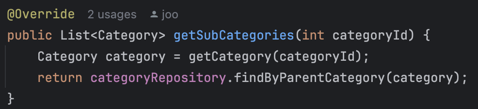 - 자식 카테고리 조회엔 categoryId만 있으면 되는데, 굳이 부모 객체를 먼저 조회하면서 쿼리가 불필요하게 한 번 더 발생한다.