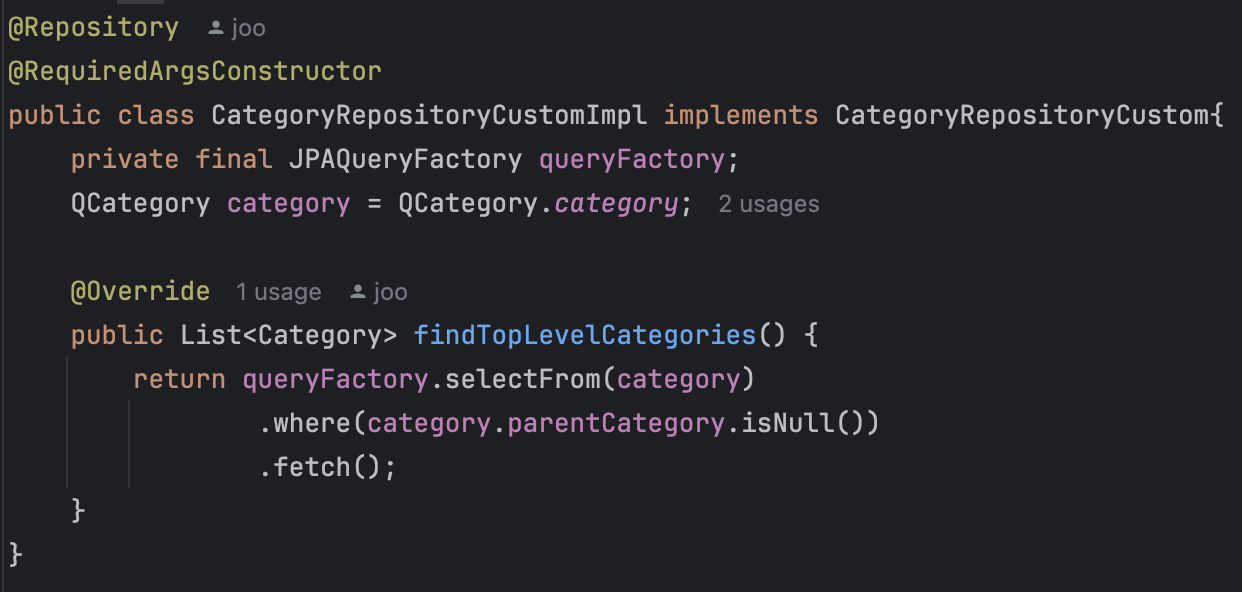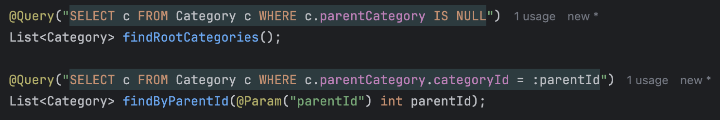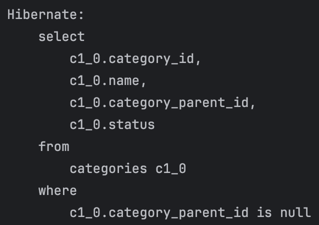 - parentCategory IS NULL 조건으로 루트 카테고리만 먼저 조회 (1개의 쿼리 발생)
