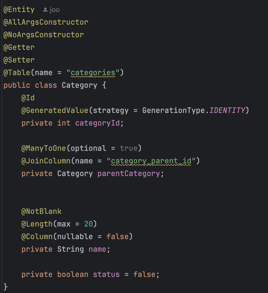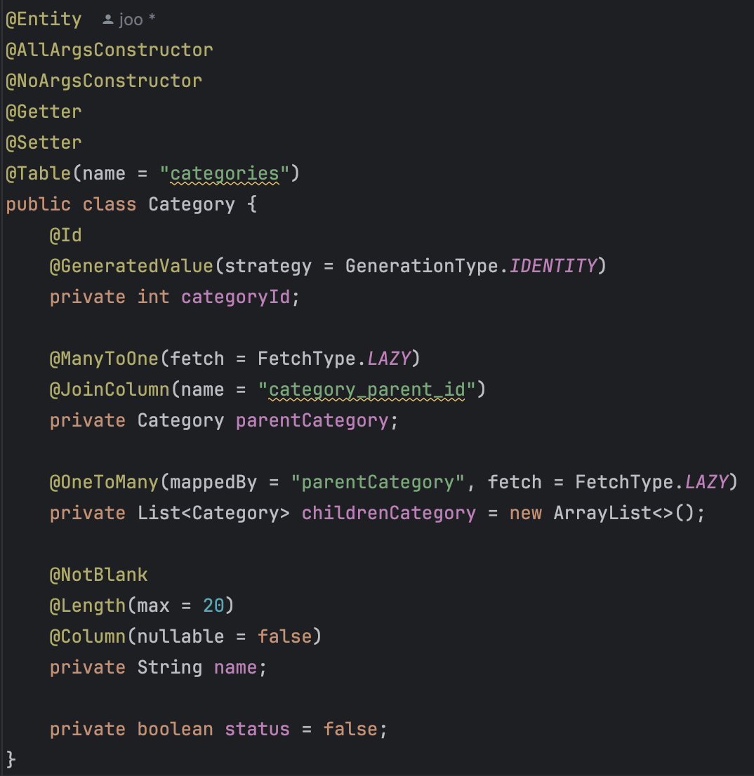 Category 엔티티는 자기 자신을 참조하는 parentCategory 필드를 통해 재귀적 계층 구조를 표현한다.