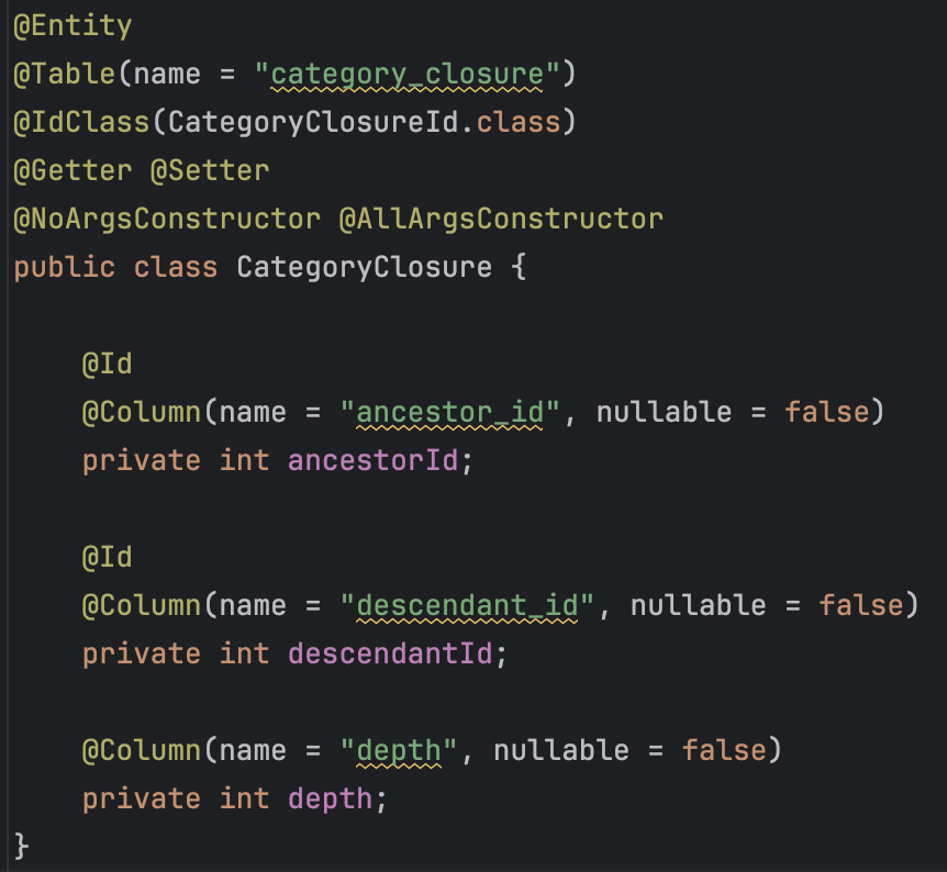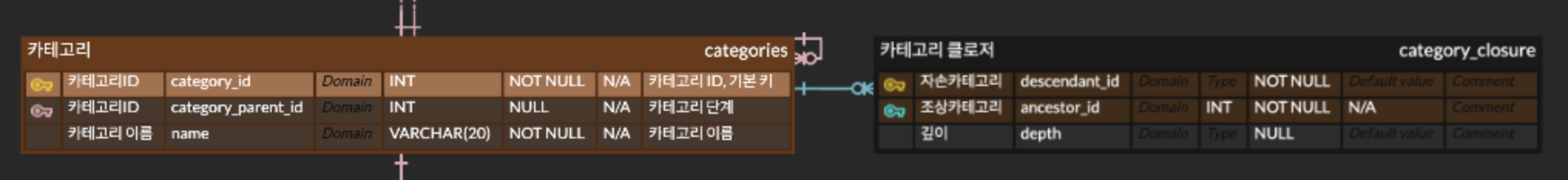 - 카테고리 계층 구조 자체에 대한 구조적 고민 → 클로저 테이블 도입
