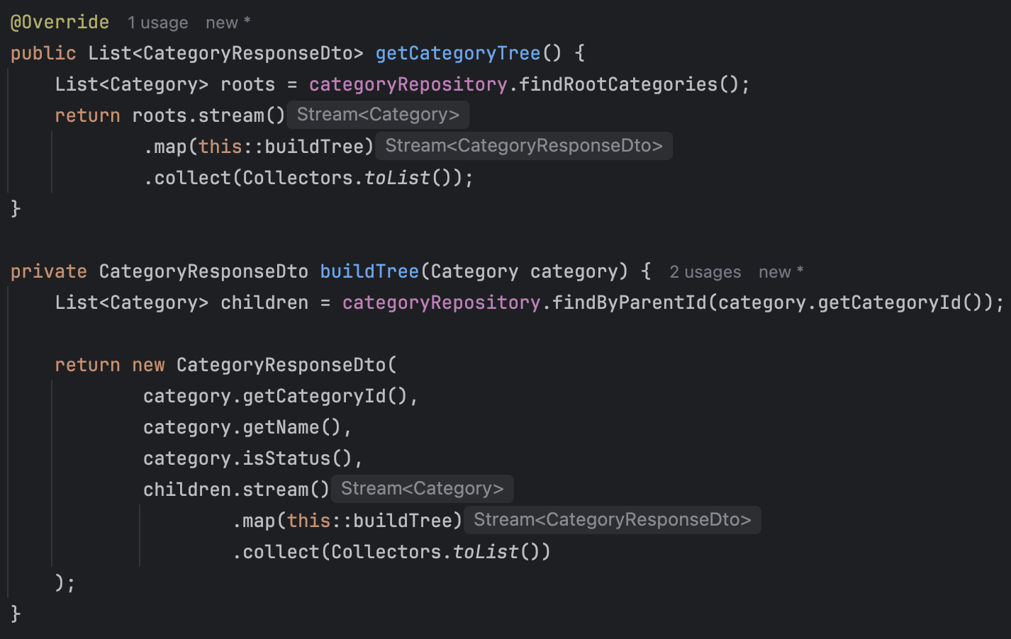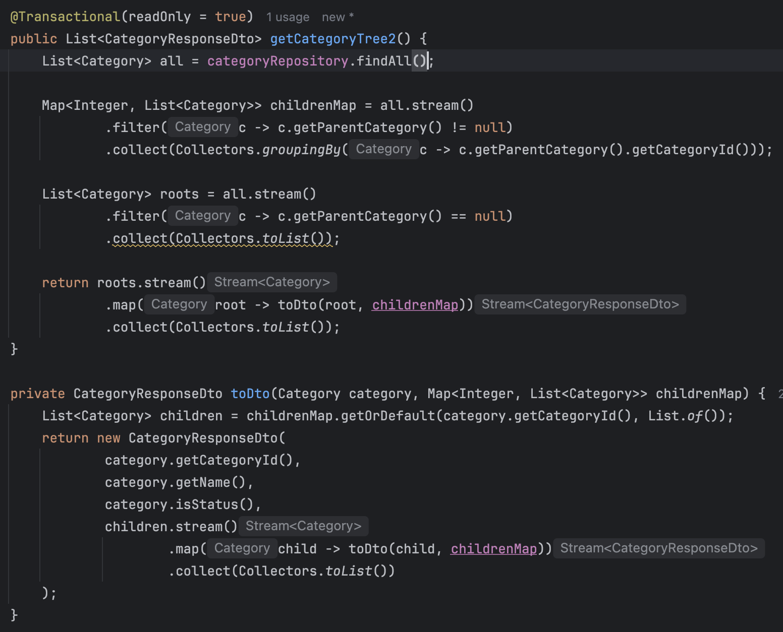 - 카테고리 트리를 재귀적으로 구성해서 프론트에 한 번에 전체 트리 구조를 내려주기 위한 구현.