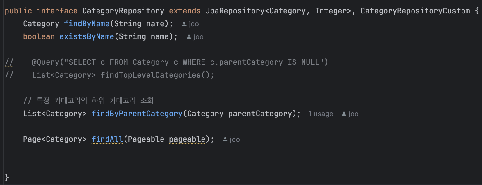- Category 엔티티에 @OneToMany(mappedBy = "parentCategory")로 자식 컬럼 추가.