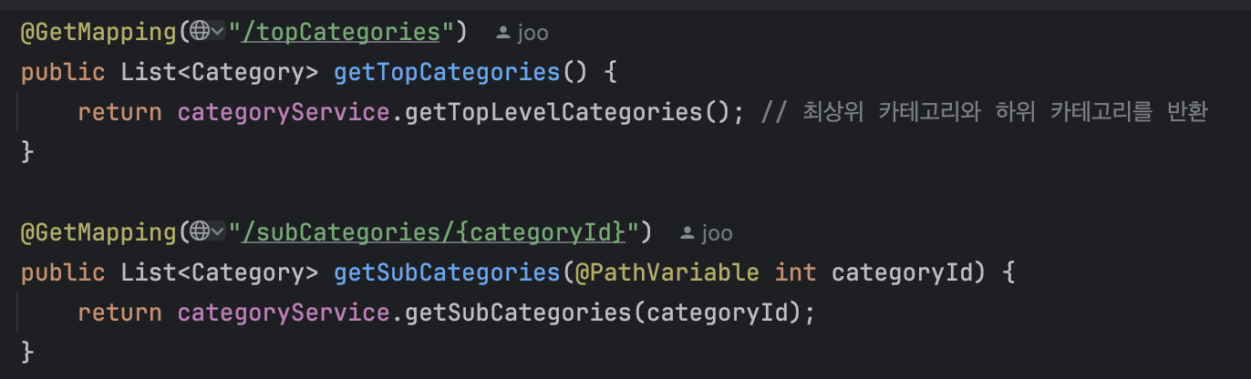- 프론트 서버에서 /topCategories로 상위 카테고리를 조회한 뒤, 각 카테고리에 대해 /subCategories/{id} API를 반복적으로 호출하여 자식 카테고리를 가져온다.