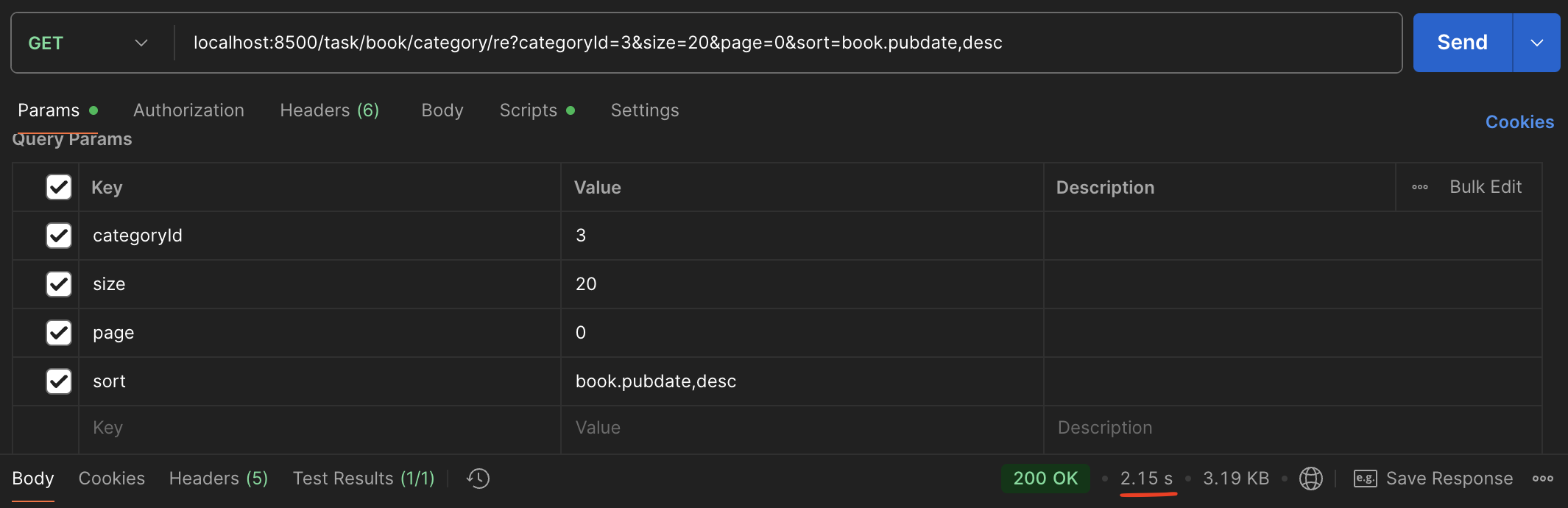 이때 books_categories(category_id, book_id) 인덱스는 잘 적용되어 약 2.0초 → 약 1.4초로 개선은 되었지만, 그 이후가 문제였다.