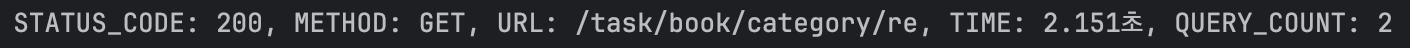 2025-08-19T16:43:56.162+09:00 INFO 3150 --- [task-service] [nio-8500-exec-3] c.n.t.c.log.QueryCountLoggingFilter : STATUS_CODE: 200, METHOD: GET, URL: /task/book/category, TIME: 1.963초, QUERY_COUNT: 23