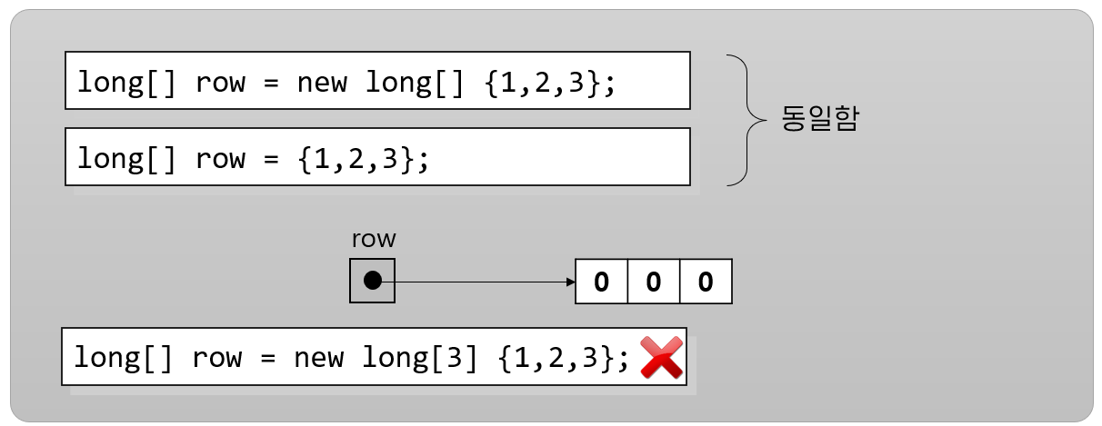 - new 키워드를 사용해서 명시적으로 배열의 인스턴스를 생성(배열의 크기도 지정)해야 한다.