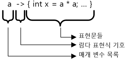- 파라미터 목록과 표현 식의 블록으로 선언.