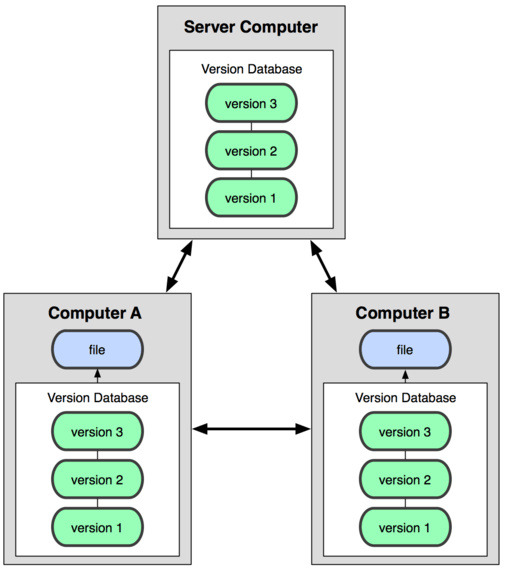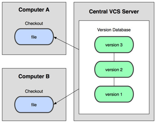 - 중앙집중식 VCS: 파일을 저장하는 중앙 서버와 여기에서 파일을 가져오는 다수의 클라이언트.
