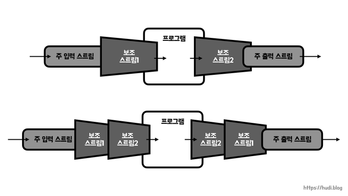 - 프로그램을 기준으로, 프로세스가 데이터의 도착지면 입력 스트림(InputStream) / 프로세스가 데이터의 출발지면 출력 스트림(OutputStream)