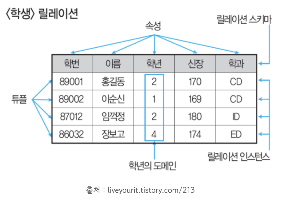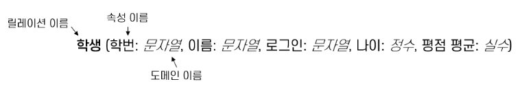 - Relation의 name / Field, Column, Attribute의 name / 각 속성의 Domain을 명세.