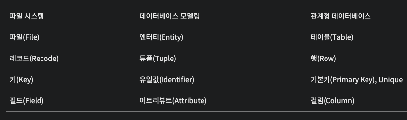- Relational Database: 서로 다른 Relation 이름을 가진 Reltaions의 모임.