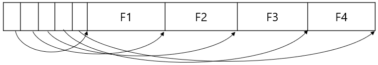 - (1) Field를 구분자($)로 구분하여 연속적으로 저장. (2) 레코드의 앞 부분에 정수로 된 offset들을 배열로 저장.