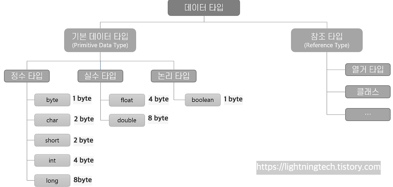 - 고정 소수점(소수점 위치가 고정적): byte, char, short, int, long