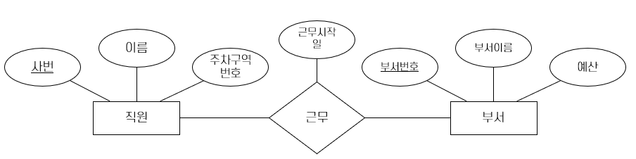 직원 - 부서의 관계인 '근무'는 '근무 시작일'이라는 설명형 속성을 가지고, '근무 테이블'은 부서와 직원의 PK인 '부서번호'와 '사번'이 근무 테이블의 기본 키가 된다.