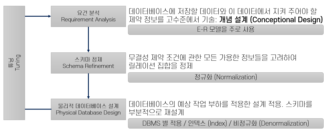 Chapter 1: Entity-Relationship ModelER 모델 개요Entity, Attribute, Entity SetRelation, Relation SetChapter 2: ER 모델 기능대응 수키 제약조건참여 제약조건약 개체 집합전문화와 일반화Chapter 3: 개념적 설계 고려사항ER 모델을 이용한 개념적 설계개체 or 속성개체 or 관계이전 관계 or 삼진 관계Chapter 1: Entity-Relationship ModelER 모델 개요DB 설계개념적 설계: Entity와 Entity 사이의 Relation 정의 -> E-R 모델 사용논리적 설계: Table과 Table 사이의 Relation 정의 -> 정규화물리적 설계: Disk에 Data가 어떻게 저장될 것인지 정의.ER 모델..