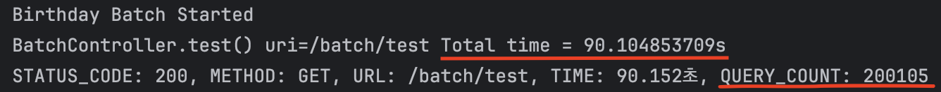 0. 개요쇼핑몰 프로젝트 당시 구현하지 못했던 생일 쿠폰 발급 요구사항을 Spring Batch로 구현했지만,개발 후 회원 규모를 확장해 가며 테스트한 결과 처리 속도가 매우 느렸다. 요구 사항은 다음과 같다. 이 글은 Spring Batch 기반 생일 쿠폰 발급 배치의 속도 개선 과정을 정리한 글이다.1. 문제 발생(1) 문제 발견회원 더미 데이터를 점차 늘려가며 배치 테스트를 하던 중, 처리 시간이 급격히 늘고 SQL 쿼리문이 굉장히 많이 발생하는 문제가 발생했다. 테스트 조건은 아래와 같다.전체 회원: 120만 명이번 달 생일자: 10만 명Chunk Size: 1000 * 더미 데이터 생성더보기(1) 프로시저DELIMITER $$DROP PROCEDURE IF EXISTS seed_members_b..